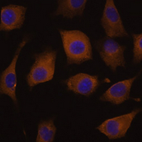 Immunofluorescent analysis of AChR alpha 7 staining in L929 cells. Formalin-fixed cells were permeabilized with 0.1% Triton X-100 in TBS for 5-10 minutes and blocked with 3% BSA-PBS for 30 minutes at room temperature. Cells were probed with the primary antibody in 3% BSA-PBS and incubated overnight at 4 °C in a humidified chamber. Cells were washed with PBST and incubated with a AF594-conjugated secondary antibody (red) in PBS at room temperature in the dark. DAPI was used to stain the cell nuclei (blue).