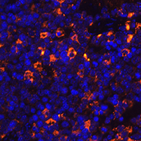 Immunofluorescent analysis of CLEC-6 staining in mouse spleen. Formalin-fixed cells were permeabilized with 0.1% Triton X-100 in TBS for 5-10 minutes and blocked with 3% BSA-PBS for 30 minutes at room temperature. Cells were probed with the primary antibody in 3% BSA-PBS and incubated overnight at 4 °C in a humidified chamber. Cells were washed with PBST and incubated with a AF594-conjugated secondary antibody (red) in PBS at room temperature in the dark. DAPI was used to stain the cell nuclei (blue).