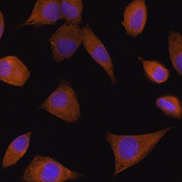 Immunofluorescent analysis of Zeta crystallin staining in L929 cells. Formalin-fixed cells were permeabilized with 0.1% Triton X-100 in TBS for 5-10 minutes and blocked with 3% BSA-PBS for 30 minutes at room temperature. Cells were probed with the primary antibody in 3% BSA-PBS and incubated overnight at 4 °C in a humidified chamber. Cells were washed with PBST and incubated with a AF594-conjugated secondary antibody (red) in PBS at room temperature in the dark. DAPI was used to stain the cell nuclei (blue).