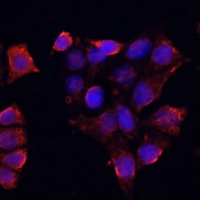 Immunofluorescent analysis of DAZL staining in HeLa cells. Formalin-fixed cells were permeabilized with 0.1% Triton X-100 in TBS for 5-10 minutes and blocked with 3% BSA-PBS for 30 minutes at room temperature. Cells were probed with the primary antibody in 3% BSA-PBS and incubated overnight at 4 °C in a hidified chamber. Cells were washed with PBST and incubated with a Alexa Fluor 594-conjugated secondary antibody (red) in PBS at room temperature in the dark.