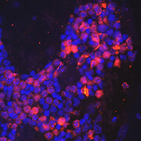 Immunofluorescent analysis of Neutrophil Elastase staining in mouse bone marrow. Formalin-fixed cells were permeabilized with 0.1% Triton X-100 in TBS for 5-10 minutes and blocked with 3% BSA-PBS for 30 minutes at room temperature. Cells were probed with the primary antibody in 3% BSA-PBS and incubated overnight at 4 °C in a humidified chamber. Cells were washed with PBST and incubated with a AF594-conjugated secondary antibody (red) in PBS at room temperature in the dark. DAPI was used to stain the cell nuclei (blue).