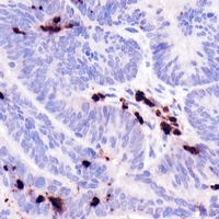 Immunohistochemical analysis of Neutrophil Elastase staining in human colon cancer formalin fixed paraffin embedded tissue section. The section was pre-treated using heat mediated antigen retrieval with sodium citrate buffer (pH 6.0). The section was then incubated with the antibody at room temperature and detected using an HRP conjugated compact polymer system. DAB was used as the chromogen. The section was then counterstained with haematoxylin and mounted with DPX. -