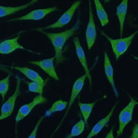 Immunofluorescent analysis of FAM127B staining in L929 cells. Formalin-fixed cells were permeabilized with 0.1% Triton X-100 in TBS for 5-10 minutes and blocked with 3% BSA-PBS for 30 minutes at room temperature. Cells were probed with the primary antibody in 3% BSA-PBS and incubated overnight at 4 °C in a humidified chamber. Cells were washed with PBST and incubated with a AF488-conjugated secondary antibody (green) in PBS at room temperature in the dark. DAPI was used to stain the cell nuclei (blue).