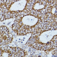 Immunohistochemical analysis of Flightless-1 staining in human colon cancer formalin fixed paraffin embedded tissue section. The section was pre-treated using heat mediated antigen retrieval with sodium citrate buffer (pH 6.0). The section was then incubated with the antibody at room temperature and detected using an HRP conjugated compact polymer system. DAB was used as the chromogen. The section was then counterstained with haematoxylin and mounted with DPX.