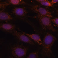 Immunofluorescent analysis of GCAT staining in C6 cells. Formalin-fixed cells were permeabilized with 0.1% Triton X-100 in TBS for 5-10 minutes and blocked with 3% BSA-PBS for 30 minutes at room temperature. Cells were probed with the primary antibody in 3% BSA-PBS and incubated overnight at 4 °C in a humidified chamber. Cells were washed with PBST and incubated with a AF594-conjugated secondary antibody (red) in PBS at room temperature in the dark. DAPI was used to stain the cell nuclei (blue).