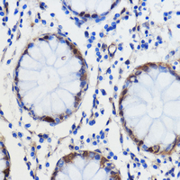 Immunohistochemical analysis of GCAT staining in human colon cancer formalin fixed paraffin embedded tissue section. The section was pre-treated using heat mediated antigen retrieval with sodium citrate buffer (pH 6.0). The section was then incubated with the antibody at room temperature and detected using an HRP conjugated compact polymer system. DAB was used as the chromogen. The section was then counterstained with haematoxylin and mounted with DPX. -