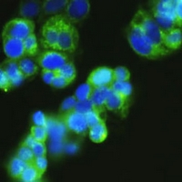 Immunofluorescent analysis of Golgin-97 staining in HepG2 cells. Formalin-fixed cells were permeabilized with 0.1% Triton X-100 in TBS for 5-10 minutes and blocked with 3% BSA-PBS for 30 minutes at room temperature. Cells were probed with the primary antibody in 3% BSA-PBS and incubated overnight at 4 °C in a hidified chamber. Cells were washed with PBST and incubated with a Alexa Fluor 488-conjugated secondary antibody (green) in PBS at room temperature in the dark.