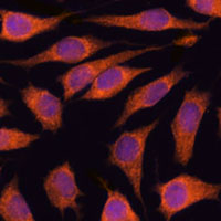 Immunofluorescent analysis of GOLPH3 staining in L929 cells. Formalin-fixed cells were permeabilized with 0.1% Triton X-100 in TBS for 5-10 minutes and blocked with 3% BSA-PBS for 30 minutes at room temperature. Cells were probed with the primary antibody in 3% BSA-PBS and incubated overnight at 4 °C in a humidified chamber. Cells were washed with PBST and incubated with a AF594-conjugated secondary antibody (red) in PBS at room temperature in the dark. DAPI was used to stain the cell nuclei (blue).