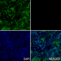 Immunohistochemical analysis of HPRT staining in rat kidney formalin fixed paraffin embedded tissue section. The section was pre-treated using heat mediated antigen retrieval with sodium citrate buffer (pH 6.0). The section was then incubated with the antibody at room temperature and detected using an HRP conjugated compact polymer system. Tyramide-AF488 (green) was used as the chromogen. The section was then counterstained with DAPI (blue).