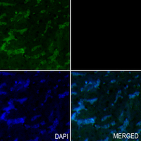 Immunohistochemical analysis of PGK1 staining in rat liver formalin fixed paraffin embedded tissue section. The section was pre-treated using heat mediated antigen retrieval with sodium citrate buffer (pH 6.0). The section was then incubated with the antibody at room temperature and detected using an HRP conjugated compact polymer system. Tyramide-AF488 (green) was used as the chromogen. The section was then counterstained with DAPI (blue).