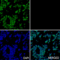Immunohistochemical analysis of Fibrillarin staining in human ovary formalin fixed paraffin embedded tissue section. The section was pre-treated using heat mediated antigen retrieval with sodium citrate buffer (pH 6.0). The section was then incubated with the antibody at room temperature and detected using an HRP conjugated compact polymer system. Tyramide-AF488 (green) was used as the chromogen. The section was then counterstained with DAPI (blue).