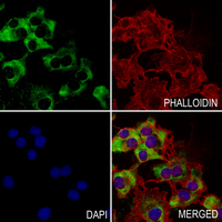 Immunofluorescent analysis of RPL10A staining in COS7 cells. Formalin-fixed cells were permeabilized with 0.1% Triton X-100 in TBS for 5-10 minutes and blocked with 3% BSA-PBS for 30 minutes at room temperature. Cells were probed with the primary antibody in 3% BSA-PBS and incubated overnight at 4 °C in a humidified chamber. Cells were washed with PBST and incubated with an AF488-conjugated secondary antibody (green) in PBS at room temperature in the dark. Phalloidin - AF594 was used to stain Actin filaments (red). DAPI was used to stain the cell nuclei (blue).