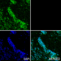 Immunohistochemical analysis of RPL10A staining in rat liver formalin fixed paraffin embedded tissue section. The section was pre-treated using heat mediated antigen retrieval with sodium citrate buffer (pH 6.0). The section was then incubated with the antibody at room temperature and detected using an HRP conjugated compact polymer system. Tyramide-AF488 (green) was used as the chromogen. The section was then counterstained with DAPI (blue). -