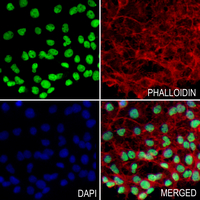 Immunofluorescent analysis of SUMO4 staining in COS7 cells. Formalin-fixed cells were permeabilized with 0.1% Triton X-100 in TBS for 5-10 minutes and blocked with 3% BSA-PBS for 30 minutes at room temperature. Cells were probed with the primary antibody in 3% BSA-PBS and incubated overnight at 4 °C in a humidified chamber. Cells were washed with PBST and incubated with an AF488-conjugated secondary antibody (green) in PBS at room temperature in the dark. Phalloidin - AF594 was used to stain Actin filaments (red). DAPI was used to stain the cell nuclei (blue).