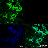 Immunohistochemical analysis of PREB staining in human colon formalin fixed paraffin embedded tissue section. The section was pre-treated using heat mediated antigen retrieval with sodium citrate buffer (pH 6.0). The section was then incubated with the antibody at room temperature and detected using an HRP conjugated compact polymer system. Tyramide-AF488 (green) was used as the chromogen. The section was then counterstained with DAPI (blue).