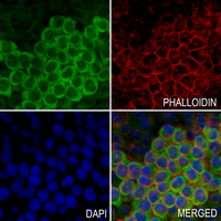 Immunofluorescent analysis of TRPV5 staining in MCF7 cells. Formalin-fixed cells were permeabilized with 0.1% Triton X-100 in TBS for 5-10 minutes and blocked with 3% BSA-PBS for 30 minutes at room temperature. Cells were probed with the primary antibody in 3% BSA-PBS and incubated overnight at 4 °C in a humidified chamber. Cells were washed with PBST and incubated with an AF488-conjugated secondary antibody (green) in PBS at room temperature in the dark. Phalloidin - AF594 was used to stain Actin filaments (red). DAPI was used to stain the cell nuclei (blue).
