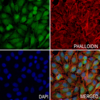 Immunofluorescent analysis of DHFR staining in A375 cells. Formalin-fixed cells were permeabilized with 0.1% Triton X-100 in TBS for 5-10 minutes and blocked with 3% BSA-PBS for 30 minutes at room temperature. Cells were probed with the primary antibody in 3% BSA-PBS and incubated overnight at 4 °C in a humidified chamber. Cells were washed with PBST and incubated with an AF488-conjugated secondary antibody (green) in PBS at room temperature in the dark. Phalloidin - AF594 was used to stain Actin filaments (red). DAPI was used to stain the cell nuclei (blue).
