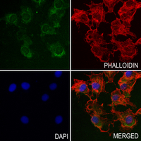 Immunofluorescent analysis of INMT staining in COS7 cells. Formalin-fixed cells were permeabilized with 0.1% Triton X-100 in TBS for 5-10 minutes and blocked with 3% BSA-PBS for 30 minutes at room temperature. Cells were probed with the primary antibody in 3% BSA-PBS and incubated overnight at 4 °C in a humidified chamber. Cells were washed with PBST and incubated with an AF488-conjugated secondary antibody (green) in PBS at room temperature in the dark. Phalloidin - AF594 was used to stain Actin filaments (red). DAPI was used to stain the cell nuclei (blue).