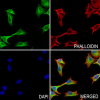 Immunofluorescent analysis of RAB5A staining in A375 cells. Formalin-fixed cells were permeabilized with 0.1% Triton X-100 in TBS for 5-10 minutes and blocked with 3% BSA-PBS for 30 minutes at room temperature. Cells were probed with the primary antibody in 3% BSA-PBS and incubated overnight at 4 °C in a humidified chamber. Cells were washed with PBST and incubated with an AF488-conjugated secondary antibody (green) in PBS at room temperature in the dark. Phalloidin - AF594 was used to stain Actin filaments (red). DAPI was used to stain the cell nuclei (blue).