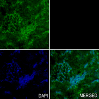 Immunohistochemical analysis of ALB staining in rat kidney formalin fixed paraffin embedded tissue section. The section was pre-treated using heat mediated antigen retrieval with sodium citrate buffer (pH 6.0). The section was then incubated with the antibody at room temperature and detected using an HRP conjugated compact polymer system. Tyramide-AF488 (green) was used as the chromogen. The section was then counterstained with DAPI (blue).