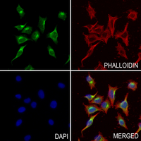 Immunofluorescent analysis of MYL9 staining in A375 cells. Formalin-fixed cells were permeabilized with 0.1% Triton X-100 in TBS for 5-10 minutes and blocked with 3% BSA-PBS for 30 minutes at room temperature. Cells were probed with the primary antibody in 3% BSA-PBS and incubated overnight at 4 °C in a humidified chamber. Cells were washed with PBST and incubated with an AF488-conjugated secondary antibody (green) in PBS at room temperature in the dark. Phalloidin - AF594 was used to stain Actin filaments (red). DAPI was used to stain the cell nuclei (blue).
