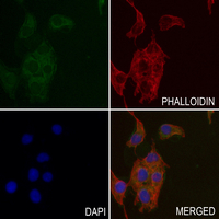 Immunofluorescent analysis of Cadherin-pan staining in COS7 cells. Formalin-fixed cells were permeabilized with 0.1% Triton X-100 in TBS for 5-10 minutes and blocked with 3% BSA-PBS for 30 minutes at room temperature. Cells were probed with the primary antibody in 3% BSA-PBS and incubated overnight at 4 °C in a humidified chamber. Cells were washed with PBST and incubated with an AF488-conjugated secondary antibody (green) in PBS at room temperature in the dark. Phalloidin - AF594 was used to stain Actin filaments (red). DAPI was used to stain the cell nuclei (blue).
