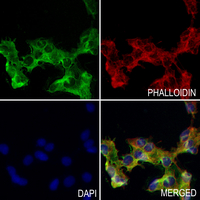 Immunofluorescent analysis of EOGT staining in COS7 cells. Formalin-fixed cells were permeabilized with 0.1% Triton X-100 in TBS for 5-10 minutes and blocked with 3% BSA-PBS for 30 minutes at room temperature. Cells were probed with the primary antibody in 3% BSA-PBS and incubated overnight at 4 °C in a humidified chamber. Cells were washed with PBST and incubated with an AF488-conjugated secondary antibody (green) in PBS at room temperature in the dark. Phalloidin - AF594 was used to stain Actin filaments (red). DAPI was used to stain the cell nuclei (blue).