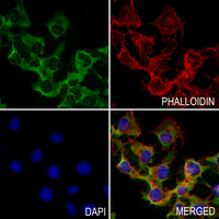 Immunofluorescent analysis of WNT2B staining in COS7 cells. Formalin-fixed cells were permeabilized with 0.1% Triton X-100 in TBS for 5-10 minutes and blocked with 3% BSA-PBS for 30 minutes at room temperature. Cells were probed with the primary antibody in 3% BSA-PBS and incubated overnight at 4 °C in a humidified chamber. Cells were washed with PBST and incubated with an AF488-conjugated secondary antibody (green) in PBS at room temperature in the dark. Phalloidin - AF594 was used to stain Actin filaments (red). DAPI was used to stain the cell nuclei (blue).