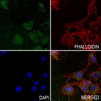 Immunofluorescent analysis of DNAJC15 staining in COS7 cells. Formalin-fixed cells were permeabilized with 0.1% Triton X-100 in TBS for 5-10 minutes and blocked with 3% BSA-PBS for 30 minutes at room temperature. Cells were probed with the primary antibody in 3% BSA-PBS and incubated overnight at 4 °C in a humidified chamber. Cells were washed with PBST and incubated with an AF488-conjugated secondary antibody (green) in PBS at room temperature in the dark. Phalloidin - AF594 was used to stain Actin filaments (red). DAPI was used to stain the cell nuclei (blue).