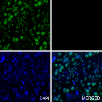 Immunohistochemical analysis of SAP61 staining in human squamous cell carcinoma formalin fixed paraffin embedded tissue section. The section was pre-treated using heat mediated antigen retrieval with sodium citrate buffer (pH 6.0). The section was then incubated with the antibody at room temperature and detected using an HRP conjugated compact polymer system. Tyramide-AF488 (green) was used as the chromogen. The section was then counterstained with DAPI (blue).