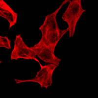 Immunofluorescent analysis of Smooth Muscle Actin staining in MCF7 cells. Formalin-fixed cells were permeabilized with 0.1% Triton X-100 in TBS for 5-10 minutes and blocked with 3% BSA-PBS for 30 minutes at room temperature. Cells were probed with the primary antibody in 3% BSA-PBS and incubated overnight at 4 °C in a humidified chamber. Cells were washed with PBST and incubated with an AF594-conjugated secondary antibody (red) in PBS at room temperature in the dark.