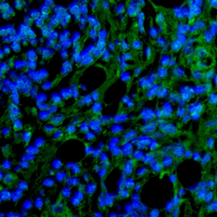 Immunohistochemical analysis of Smooth Muscle Actin staining in human colon cancer formalin fixed paraffin embedded tissue section. The section was pre-treated using heat mediated antigen retrieval with sodium citrate buffer (pH 6.0). The section was then incubated with the antibody at room temperature and detected using an HRP conjugated compact polymer system. Tyramide-AF488 (green) was used as the chromogen. The section was then counterstained with DAPI (blue). -