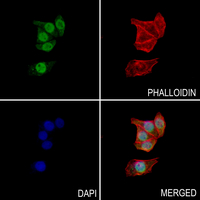 Immunofluorescent analysis of PKN2 staining in MCF7 cells. Formalin-fixed cells were permeabilized with 0.1% Triton X-100 in TBS for 5-10 minutes and blocked with 3% BSA-PBS for 30 minutes at room temperature. Cells were probed with the primary antibody in 3% BSA-PBS and incubated overnight at 4 °C in a humidified chamber. Cells were washed with PBST and incubated with an AF488-conjugated secondary antibody (green) in PBS at room temperature in the dark. Phalloidin - AF594 was used to stain Actin filaments (red). DAPI was used to stain the cell nuclei (blue).