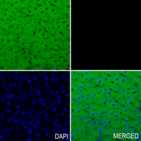 Immunohistochemical analysis of ACAT2 staining in rat liver formalin fixed paraffin embedded tissue section. The section was pre-treated using heat mediated antigen retrieval with sodium citrate buffer (pH 6.0). The section was then incubated with the antibody at room temperature and detected using an HRP conjugated compact polymer system. Tyramide-AF488 (green) was used as the chromogen. The section was then counterstained with DAPI (blue).