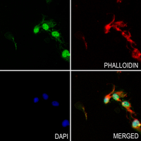 Immunofluorescent analysis of DAZAP1 staining in COS7 cells. Formalin-fixed cells were permeabilized with 0.1% Triton X-100 in TBS for 5-10 minutes and blocked with 3% BSA-PBS for 30 minutes at room temperature. Cells were probed with the primary antibody in 3% BSA-PBS and incubated overnight at 4 °C in a humidified chamber. Cells were washed with PBST and incubated with an AF488-conjugated secondary antibody (green) in PBS at room temperature in the dark. Phalloidin - AF594 was used to stain Actin filaments (red). DAPI was used to stain the cell nuclei (blue).