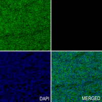 Immunohistochemical analysis of UBA52 staining in human tonsil formalin fixed paraffin embedded tissue section. The section was pre-treated using heat mediated antigen retrieval with sodium citrate buffer (pH 6.0). The section was then incubated with the antibody at room temperature and detected using an HRP conjugated compact polymer system. Tyramide-AF488 (green) was used as the chromogen. The section was then counterstained with DAPI (blue).