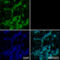 Immunohistochemical analysis of SATB2 staining in rat kidney formalin fixed paraffin embedded tissue section. The section was pre-treated using heat mediated antigen retrieval with sodium citrate buffer (pH 6.0). The section was then incubated with the antibody at room temperature and detected using an HRP conjugated compact polymer system. Tyramide-AF488 (green) was used as the chromogen. The section was then counterstained with DAPI (blue).
