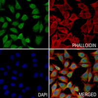 Immunofluorescent analysis of PSMB8 staining in A375 cells. Formalin-fixed cells were permeabilized with 0.1% Triton X-100 in TBS for 5-10 minutes and blocked with 3% BSA-PBS for 30 minutes at room temperature. Cells were probed with the primary antibody in 3% BSA-PBS and incubated overnight at 4 °C in a humidified chamber. Cells were washed with PBST and incubated with an AF488-conjugated secondary antibody (green) in PBS at room temperature in the dark. Phalloidin - AF594 was used to stain Actin filaments (red). DAPI was used to stain the cell nuclei (blue).
