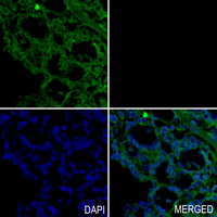 Immunohistochemical analysis of Dia 1 staining in human ovarian formalin fixed paraffin embedded tissue section. The section was pre-treated using heat mediated antigen retrieval with sodium citrate buffer (pH 6.0). The section was then incubated with the antibody at room temperature and detected using an HRP conjugated compact polymer system. Tyramide-AF488 (green) was used as the chromogen. The section was then counterstained with DAPI (blue).