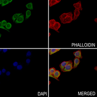 Immunofluorescent analysis of CALU staining in MCF7 cells. Formalin-fixed cells were permeabilized with 0.1% Triton X-100 in TBS for 5-10 minutes and blocked with 3% BSA-PBS for 30 minutes at room temperature. Cells were probed with the primary antibody in 3% BSA-PBS and incubated overnight at 4 °C in a humidified chamber. Cells were washed with PBST and incubated with an AF488-conjugated secondary antibody (green) in PBS at room temperature in the dark. Phalloidin - AF594 was used to stain Actin filaments (red). DAPI was used to stain the cell nuclei (blue).