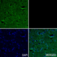 Immunohistochemical analysis of LCAT staining in human Brain formalin fixed paraffin embedded tissue section. The section was pre-treated using heat mediated antigen retrieval with sodium citrate buffer (pH 6.0). The section was then incubated with the antibody at room temperature and detected using an HRP conjugated compact polymer system. Tyramide-AF488 (green) was used as the chromogen. The section was then counterstained with DAPI (blue).