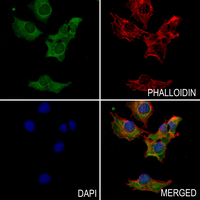 Immunofluorescent analysis of TMOD2 staining in COS7 cells. Formalin-fixed cells were permeabilized with 0.1% Triton X-100 in TBS for 5-10 minutes and blocked with 3% BSA-PBS for 30 minutes at room temperature. Cells were probed with the primary antibody in 3% BSA-PBS and incubated overnight at 4 °C in a humidified chamber. Cells were washed with PBST and incubated with an AF488-conjugated secondary antibody (green) in PBS at room temperature in the dark. Phalloidin - AF594 was used to stain Actin filaments (red). DAPI was used to stain the cell nuclei (blue).