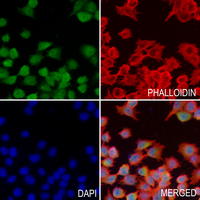Immunofluorescent analysis of SEC14L2 staining in A375 cells. Formalin-fixed cells were permeabilized with 0.1% Triton X-100 in TBS for 5-10 minutes and blocked with 3% BSA-PBS for 30 minutes at room temperature. Cells were probed with the primary antibody in 3% BSA-PBS and incubated overnight at 4 °C in a humidified chamber. Cells were washed with PBST and incubated with an AF488-conjugated secondary antibody (green) in PBS at room temperature in the dark. Phalloidin - AF594 was used to stain Actin filaments (red). DAPI was used to stain the cell nuclei (blue).