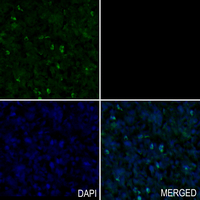 Immunohistochemical analysis of SATB1 staining in human stomach formalin fixed paraffin embedded tissue section. The section was pre-treated using heat mediated antigen retrieval with sodium citrate buffer (pH 6.0). The section was then incubated with the antibody at room temperature and detected using an HRP conjugated compact polymer system. Tyramide-AF488 (green) was used as the chromogen. The section was then counterstained with DAPI (blue).