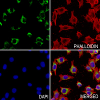 Immunofluorescent analysis of CCR8 staining in A375 cells. Formalin-fixed cells were permeabilized with 0.1% Triton X-100 in TBS for 5-10 minutes and blocked with 3% BSA-PBS for 30 minutes at room temperature. Cells were probed with the primary antibody in 3% BSA-PBS and incubated overnight at 4 °C in a hidified chamber. Cells were washed with PBST and incubated with a AF488-conjugated secondary antibody (green) in PBS at room temperature in the dark. Phalloidin - AF594 was used to stain Actin filaments (red). DAPI was used to stain the cell nuclei (blue).