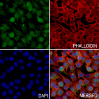 Immunofluorescent analysis of Thymidylate Synthase staining in A375 cells. Formalin-fixed cells were permeabilized with 0.1% Triton X-100 in TBS for 5-10 minutes and blocked with 3% BSA-PBS for 30 minutes at room temperature. Cells were probed with the primary antibody in 3% BSA-PBS and incubated overnight at 4 °C in a hidified chamber. Cells were washed with PBST and incubated with a AF488-conjugated secondary antibody (green) in PBS at room temperature in the dark. Phalloidin - AF594 was used to stain Actin filaments (red). DAPI was used to stain the cell nuclei (blue).