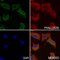 Immunofluorescent analysis of SF2 staining in MCF7 cells. Formalin-fixed cells were permeabilized with 0.1% Triton X-100 in TBS for 5-10 minutes and blocked with 3% BSA-PBS for 30 minutes at room temperature. Cells were probed with the primary antibody in 3% BSA-PBS and incubated overnight at 4 °C in a hidified chamber. Cells were washed with PBST and incubated with a AF488-conjugated secondary antibody (green) in PBS at room temperature in the dark. Phalloidin - AF594 was used to stain Actin filaments (red). DAPI was used to stain the cell nuclei (blue).