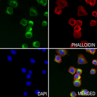 Immunofluorescent analysis of ERGIC-53 staining in A375 cells. Formalin-fixed cells were permeabilized with 0.1% Triton X-100 in TBS for 5-10 minutes and blocked with 3% BSA-PBS for 30 minutes at room temperature. Cells were probed with the primary antibody in 3% BSA-PBS and incubated overnight at 4 °C in a hidified chamber. Cells were washed with PBST and incubated with a AF488-conjugated secondary antibody (green) in PBS at room temperature in the dark. Phalloidin - AF594 was used to stain Actin filaments (red). DAPI was used to stain the cell nuclei (blue).