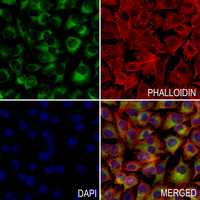 Immunofluorescent analysis of eIF2 alpha staining in A375 cells. Formalin-fixed cells were permeabilized with 0.1% Triton X-100 in TBS for 5-10 minutes and blocked with 3% BSA-PBS for 30 minutes at room temperature. Cells were probed with the primary antibody in 3% BSA-PBS and incubated overnight at 4 °C in a hidified chamber. Cells were washed with PBST and incubated with a AF488-conjugated secondary antibody (green) in PBS at room temperature in the dark. Phalloidin - AF594 was used to stain Actin filaments (red). DAPI was used to stain the cell nuclei (blue).