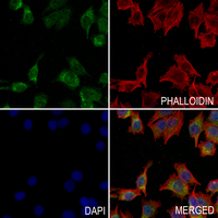 Immunofluorescent analysis of GALT staining in A375 cells. Formalin-fixed cells were permeabilized with 0.1% Triton X-100 in TBS for 5-10 minutes and blocked with 3% BSA-PBS for 30 minutes at room temperature. Cells were probed with the primary antibody in 3% BSA-PBS and incubated overnight at 4 °C in a hidified chamber. Cells were washed with PBST and incubated with a AF488-conjugated secondary antibody (green) in PBS at room temperature in the dark. Phalloidin - AF594 was used to stain Actin filaments (red). DAPI was used to stain the cell nuclei (blue).
